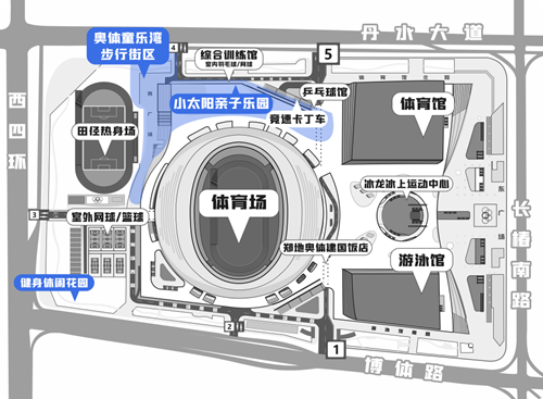 奧體童樂灣步行街區(qū)西鄰田徑訓(xùn)練場,適合開展足球、慢跑、飛盤等親子運動,南側(cè)配備有“奧體便民共享便利店”和衛(wèi)生間,向東可直達體育場二層平臺的“小太陽”網(wǎng)紅打卡地,不僅視野開闊,能一覽各場館建筑風(fēng)貌,還配備了攀爬架、沙坑、秋千等兒童玩樂項目。