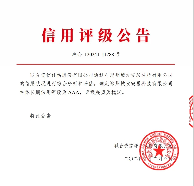 12月5日,鄭州城市發(fā)展集團(tuán)有限公司下屬子公司鄭州城發(fā)安居科技有限公司(以下簡(jiǎn)稱安居科技)順利取得AAA主體信用評(píng)級(jí),評(píng)級(jí)展望為“穩(wěn)定”,成功邁入國(guó)內(nèi)企業(yè)信用等級(jí)第一梯隊(duì)。